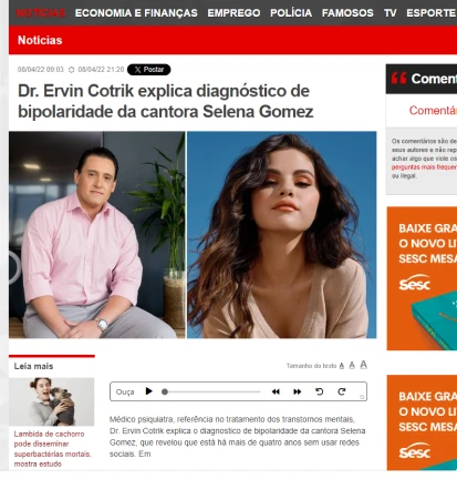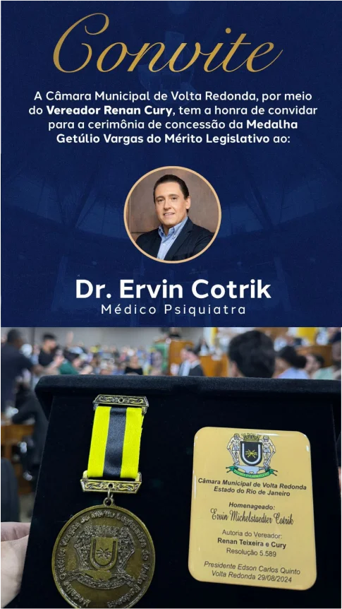 Ivy Leite10/10/2025 Quando eu conheci dr. Ervin, eu estava com síndrome do pânico e transtorno da ansiedade. Foi uma fase muito difícil. Mas, com o medico certo, na hora certa tudo fluiu. Uma amiga, me encaminhou e comecei o tratamento, farmacológico e TCC. TCC foi vida para mim, e dei sorte de fazer com o melhor. Dr. Ervin, me salvou de verdade. Até hoje faço acompanhamento com ele. Sigo firme. Eu não só indico, eu afirmo que se eu não tivesse encontrado um anjo, com a competência dele, com o amor dele pela profissão. Não sei o que teria sido da minha saúde mental. Tratar da nossa saúde mental é um compromisso. E não tenho nenhuma vergonha de dizer que me trato com um psiquiatra, aliás, o melhor! Aproveito para agradecer ao Dr. Ervin Cotrik, por tudo que fez e vem fazendo por mim. Gratidão. Mariacvl201929/08/2025 Fiquei muito satisfeita com o atendimento do Dr. Ervin🙌. Ele foi extremamente atencioso, ouviu com paciência tudo o que eu tinha a dizer (não corre na consulta) e explicou as opções de tratamento de forma clara e acolhedora. Senti que ele realmente se importou com minha situação, criando um ambiente de confiança que fez toda a diferença. Recomendo muito o profissionalismo e a humanidade dele. Gloria Maria de Miranda Evaristo17/01/2025 Com a pandemia desenvolvi uma crise de ansiedade generalizada e graças a Deus tive a indicação, através de uma amiga, do dr. Ervin, que me atendeu, e me curou dessa crise que nunca havia passado. Excelente profissional e ser humano, nos escuta com atenção, orienta, e está sempre disposto a nos ajudar em caso de necessidade. Tenho imensa gratidão a ele por tudo. Luiza03/01/2025 Passei uma vida lutando contra o transtorno bipolar. Quando tive uma crise mais séria somente o dr Ervin, às vésperas do Natal de alguns ano atrás, aceitou o meu caso. Jamais achei que conseguiria ter o equilíbrio que tenho hoje. Descobri que havia sido mal medicada a minha vida toda. Ele me disse que eu tinha que confiar no processo e assim o fiz. Hoje me faltam palavras pra descrever o tamanho da minha gratidão. Adriana Gameiro12/12/2024 Doutor Ervin Cotrik é um excelente profissional da psiquiatria. Estudioso, aplicado, atento e humano, atua no mundo acadêmico como pesquisador e professor, sem prejuízo dos atendimentos em consultório e em organizações não governamentais. Ainda, incansável na divulgação da saúde mental, confere palestras educativas, participa de programa de TV e suas lives nas redes sociais alcançam números expressivos. É um médico que efetivamente se importa com seu paciente. Recomendo muito a quem precisa! Mayara Caetano da Costa06/12/2024 O tratamento com Dr. Ervin, vem me fortificando, equilibrando e me mostrando que a vida pode e deve ser vivida com qualidade e saúde mental. O trabalho de resgate individual e na esfera social realizado por Dr. Ervin é lindo! Através de constante disseminação e desmistificação da Psiquiatria, combate o preconceito, possibilita acesso a tratamento por meio de projetos sociais, viabiliza acesso à informações e assim, salva vidas. Cheio de humanidade, generosidade, competência e ética. Por todos esses motivos me sinto segura e acolhida. O que é de extrema importância para ressignificar a vida e encontrar motivação para dar continuidade ao tratamento. Eu sempre digo que no trabalho desempenhado por Dr. Ervin além de todo conhecimento e domínio da técnica, existe um dom muito bonito dado por Deus... É como aquela citação de Carl Jung: "Conheça todas as teorias, domine todas as técnicas, mas ao tocar uma alma humana, seja apenas outra alma humana." Eu sou muito grata por sua alma enxergar a minha e por ser tratada e cuidada com toda humanidade necessária para vencer a vulnerabilidade. Que Deus abençoe seu lindo dom e sua vida tão valiosa. Muito obrigada por tudo! Mariana Castro04/12/2024 Dr.Ervin Cotrik, um profissional de excelência.,e eu como sua paciente quero expressar minha admiração pelo seu trabalho incansável e dedicação aos pacientes. Você faz a diferença na vida de muitas pessoas e merece todo o reconhecimento. Parabéns! Thais Thomazini03/12/2024 Dr. Ervin é um excelente profissional, além de atencioso, ético, humano e cuidadoso com seus pacientes. Faço tratamento com ele há alguns anos e desde a primeira consulta ele me esclareceu dúvidas e me fez entender sobre meu problema e sobre como funcionavam os medicamentos, o que fez toda diferença no tratamento. São raros os médicos que se importam e amam a profissão. Recomendo demais o Dr. Ervin Cotrik, psiquiatra fantástico. Ivania Silva03/12/2024 Bastante positiva. Excelente médico e um ser humano maravilhoso Marcela Quirino03/12/2024 O tratamento com Doutor Ervin tem sido um divisor de águas na minha vida. Desde a primeira consulta, em Março de 2024, saí de um estado de prostração e voltei a ser ativa e funcional e o melhor tem sido a estabilidade mantida até aqui. A meu ver, ele é um médico de uma humanidade rara aliada a explicações objetivas e simples ao meu entendimento. Ele é acessível e continua me atendendo diante da necessidade de esclarecimentos e de avaliação dos demais tratamentos que tenho feito. Recomendo seus serviços sem reservas. Gratidão Doutor❤️